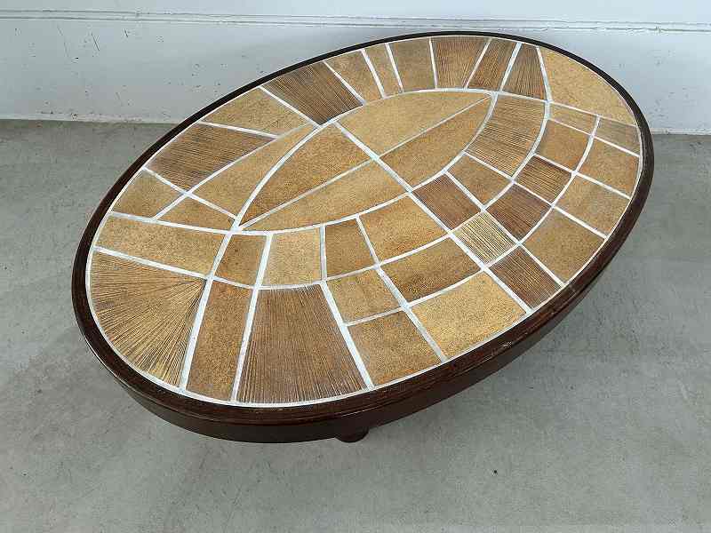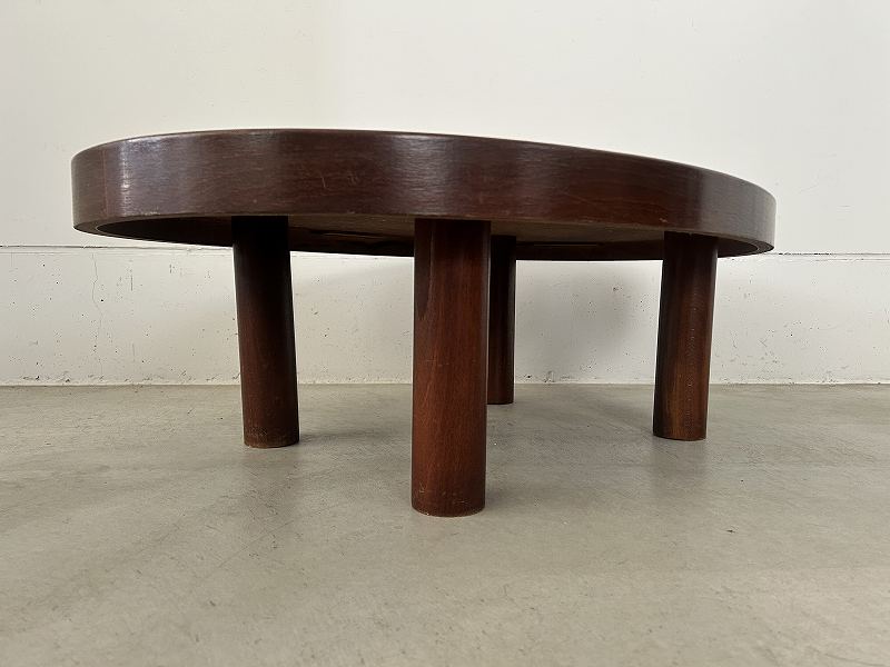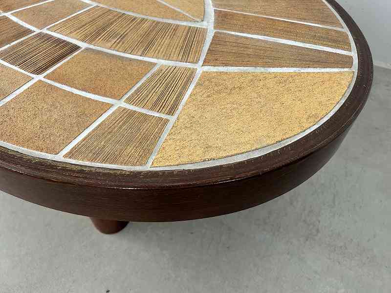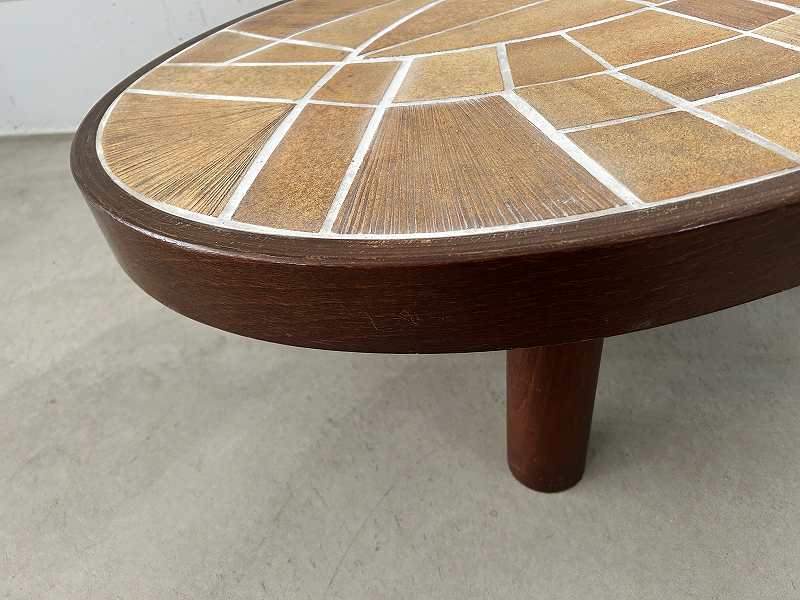 無垢材の短い脚と厚い天板が特徴的で、木の質感と温かみのあるタイルでブルータリズム的なデザインとなっています。