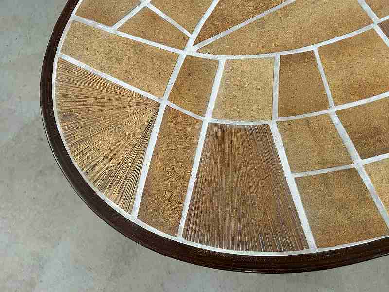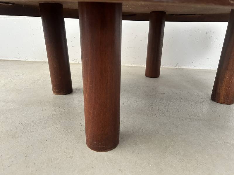 無垢材の短い脚と厚い天板が特徴的で、木の質感と温かみのあるタイルでブルータリズム的なデザインとなっています。